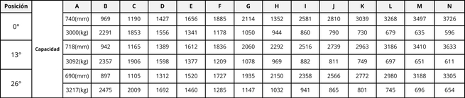 Su capacidad de carga máxima es de 3.200 kg, pero varía significativamente según los 2 parámetros anteriores. Le recomendamos referirse al cuadro técnico a continuación.